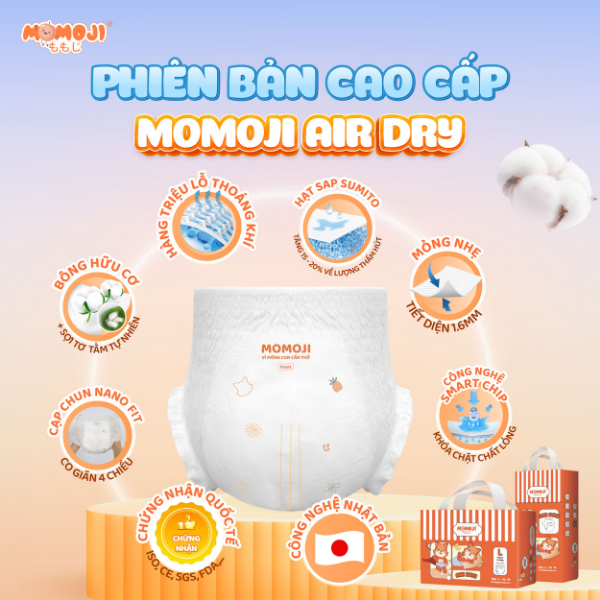 Momoji hiểu rằng, chăm con là một hành trình không hề dễ dàng. Vì thế, tã bỉm Momoji Air Dry ra đời không chỉ nhằm mang đến cho bé cảm giác thoải mái, khô ráo cả ngày – mà còn góp phần giúp mẹ bỉm an tâm hơn.
